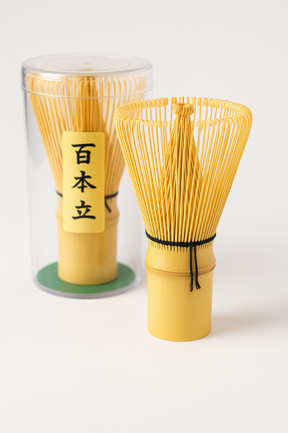 Hagyományos, világos színű 100 szálas bambuszecset a matcha csomómentes elkeveréséhez, műanyagtokban.