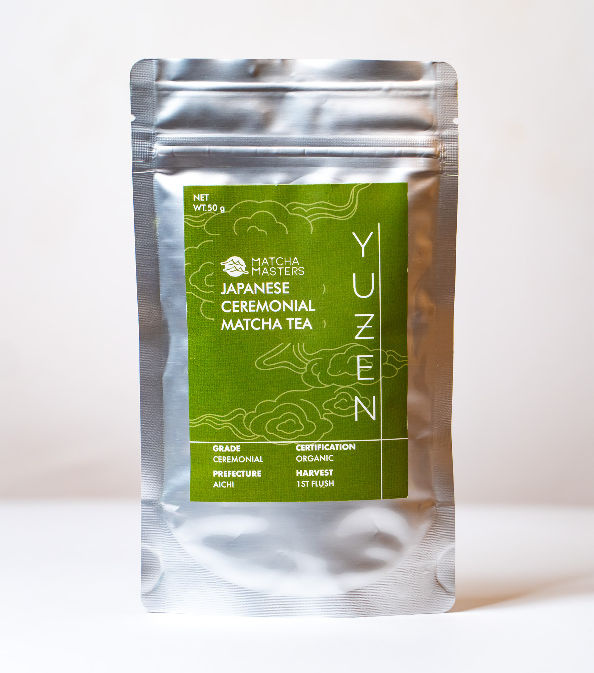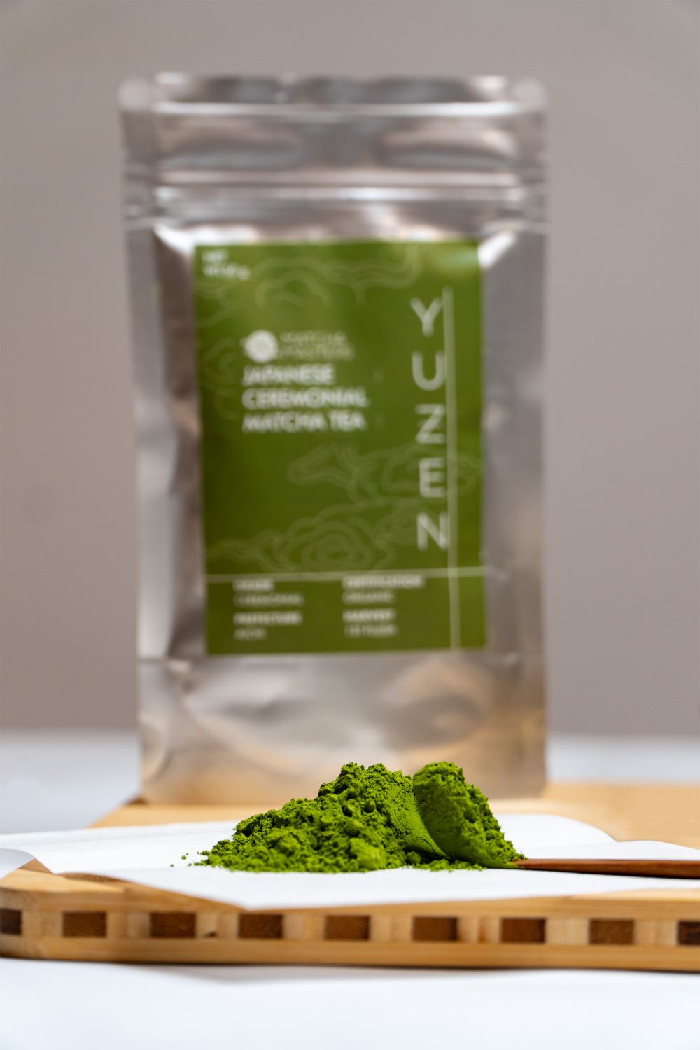 Ceremoniális**** kategóriájú, teaszertartási minőséget képviselő matcha Japánból, Aichi prefektúrából. A Yuzen ceremoniális matcha a tavaszi első szüret válogatott leveleiből készül gondos feldolgozással. Színe élénk jádezöld, íze összetett, koncentrált. Umamiban gazdag karakterét finom édesség kíséri, ami hosszú lecsengést ad a belőle készített teának.